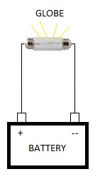 - Battery: The positive terminal of the battery is connected to one terminal of a light bulb (the globe).