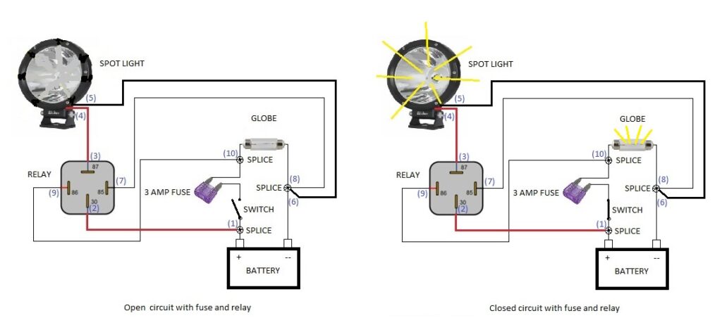 Now, when you turn on the switch, it will activate the relay, which closes the circuit and allows current to flow to the spotlight. The light will illuminate once the relay is activated.